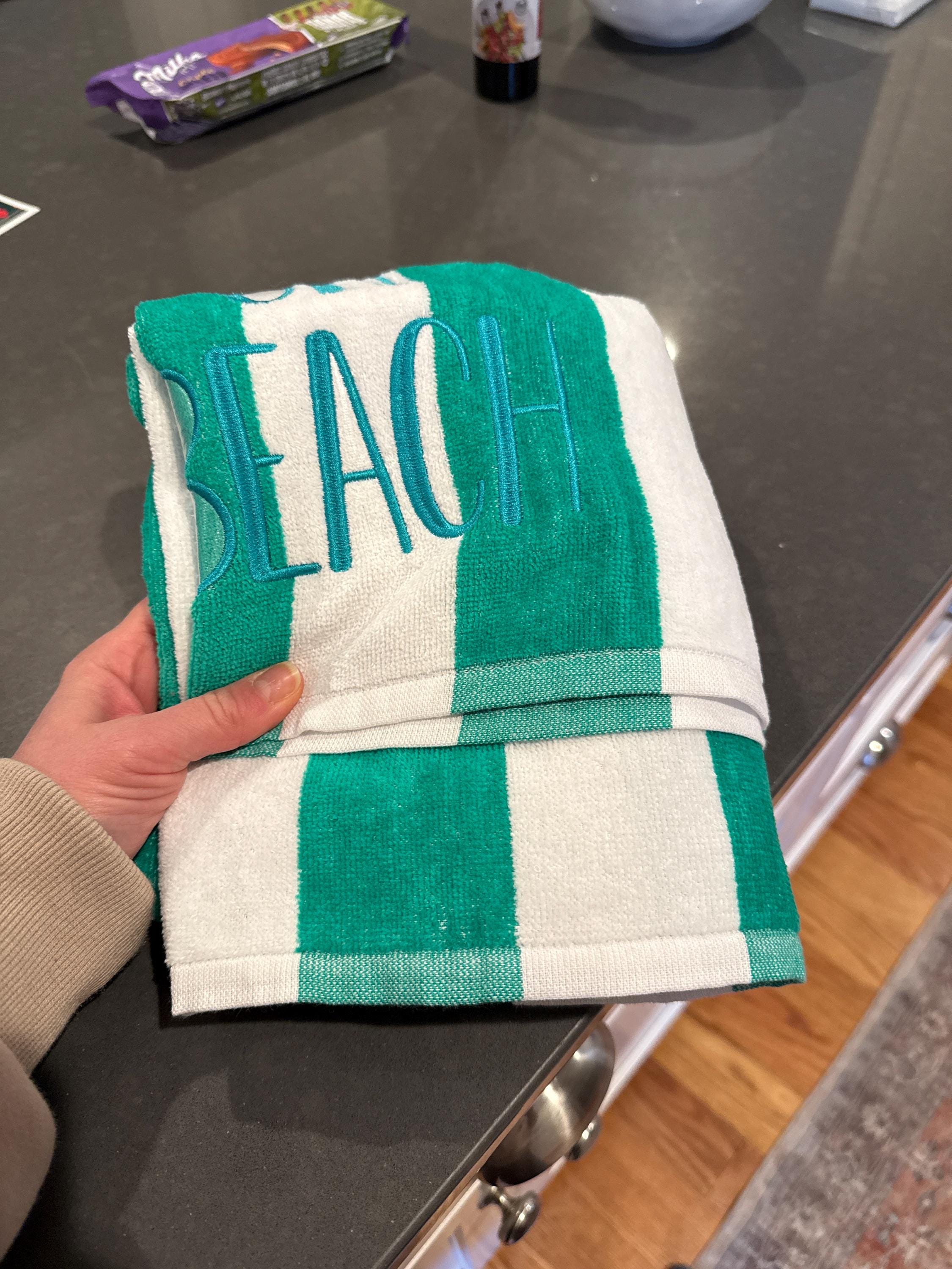 These towels were tiny and thin. So disappointing as I thought I was ordering Beach Towels and these are about the size of a standard bath towel and as thin as a dish towel. It was a gift and I’m honestly embarrassed to give it to my friend tomorrow