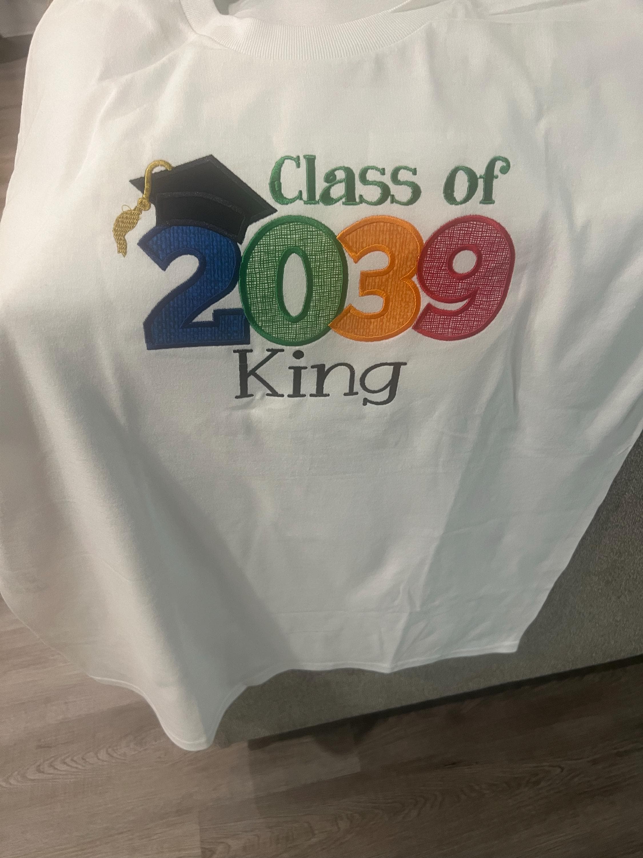 This listing if for an adorable custom embroidered cotton t-shirt with your child’s Class of and Year with their name created for children entering PREK in the fall of 2025. This Shirt is embroidered on and ADULT L or XL White cotton T-shirt. Why an Adult sized shirt you ask?? The idea behind this shirt is to watch your child grow during their elementary and high school years. By the time your little one is a senior in high school the shirt should fit better than it did when they started PREK. Its such a cute way to make memories, watch them grow, and after High School Graduation, this shirt can be added to a beautiful T-shirt quilt filed with their school memories. This is an appliqué design and the fabric used on the appliqué portions may vary due to patterns in the fabric. This shirt is currently offered in the color fabric shown: Navy Blue, Green, Orange, and Red.