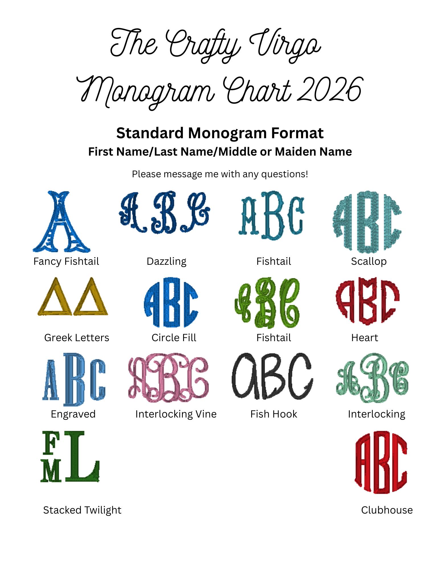 -monogram design type (see photos for design type) and Initials for monogram in the following format (FIRST LAST MIDDLE) I stitch the monogram as it is sent to me! If you have ANY questions about monogram order PLEASE send me a message!