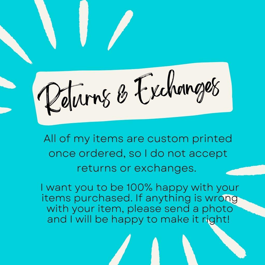 I pride myself on producing quality personalized handmade products, because of this please allow 2-10 business days for production, most of the time it is sooner. Due to the nature of this product being personalized and made to order, returns are NOT accepted. If there is an issue with your order please reach out to me and I will do my best to make it right!